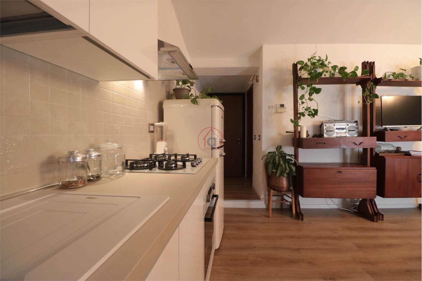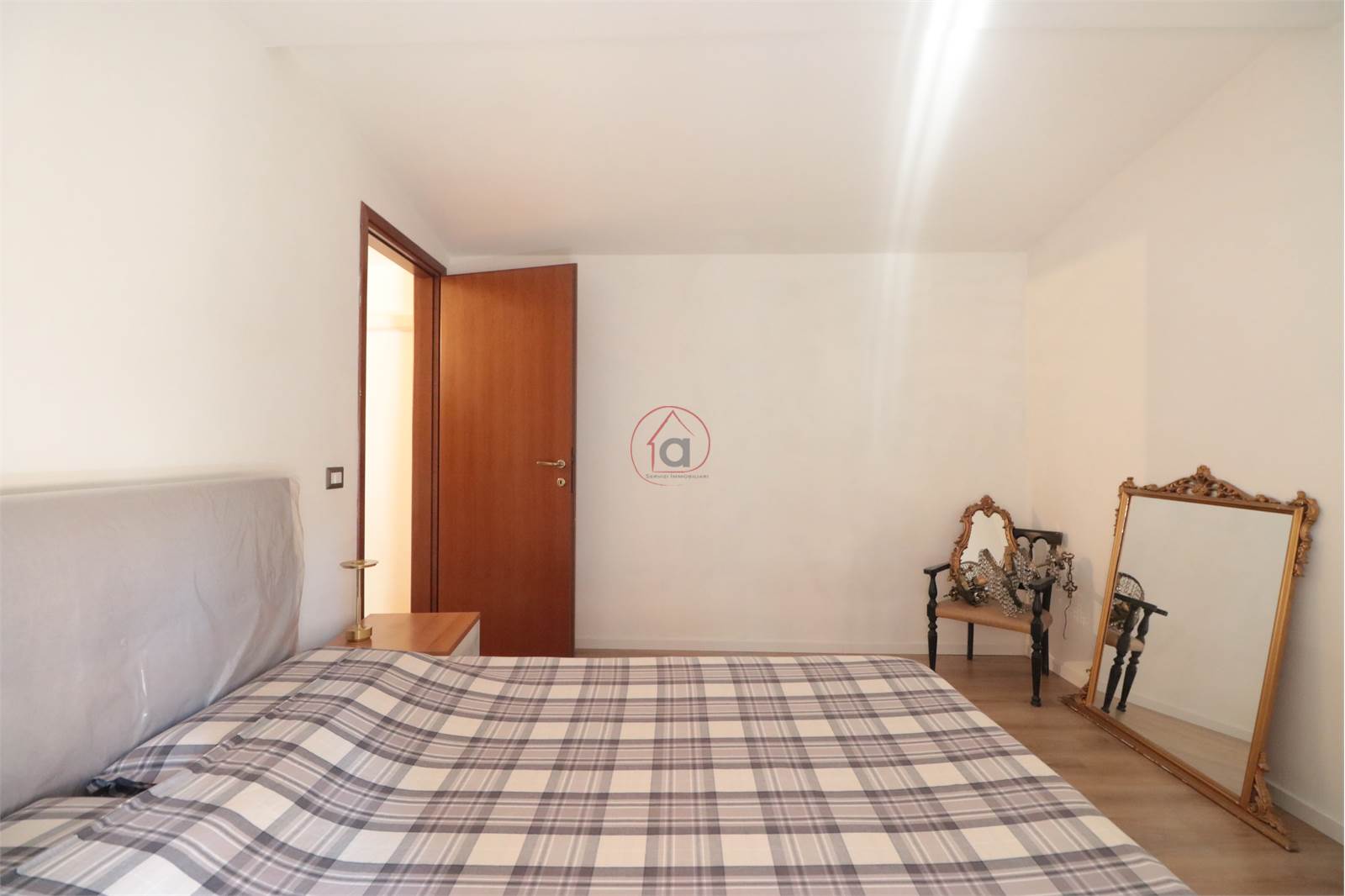 L'appartamento è composto da un ingresso nel soggiorno con angolo cottura, disimpegno, camera singola, camera matrimoniale, bagno con doccia. Tramite la portafinestra situata in bagno, si accede ad un balcone che porta direttamente ad una stanza di quasi 9 metri usata come ripostiglio/lavanderia.