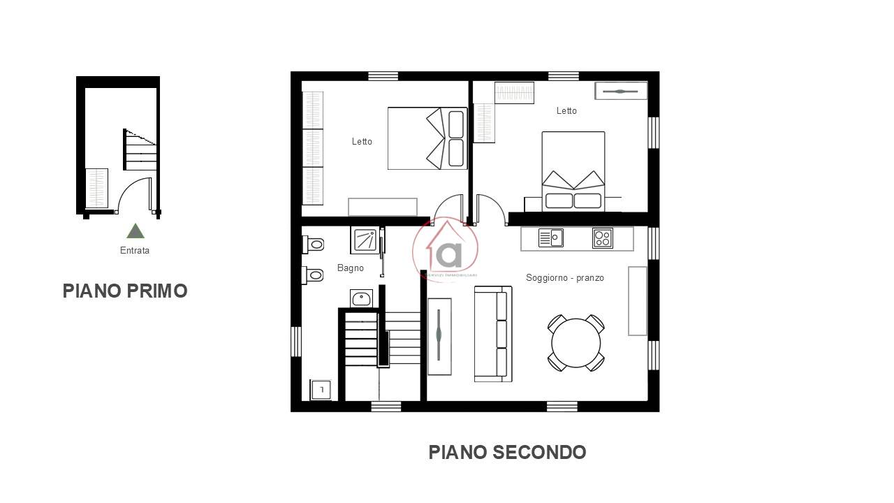 L'appartamento ha l'ingresso al primo piano dove si trova il locale tecnico, il ripostiglio e la scala in legno dalla quale si accede all'appartamento che è composto da soggiorno con angolo cottura, due camere da letto, bagno con lavanderia.