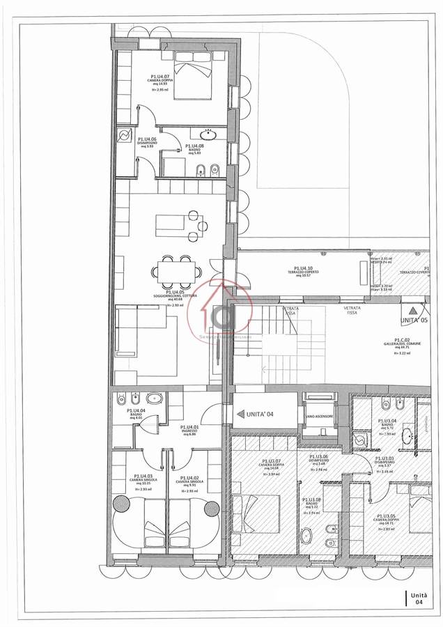 L'immobile ha un affaccio sul cortile condominiale ed è posto al primo piano servito d'ascensore ed è composto da ampio ingresso, zona giorno di 40 mq con cucina a vista e predisposizione per chi desidera la cucina con penisola, terrazzo coperto, camera da letto matrimoniale con bagno annesso e zona lavanderia, due camere singole e altro bagno. Possibilità di acquistare un posto auto e cantina a piano terra.