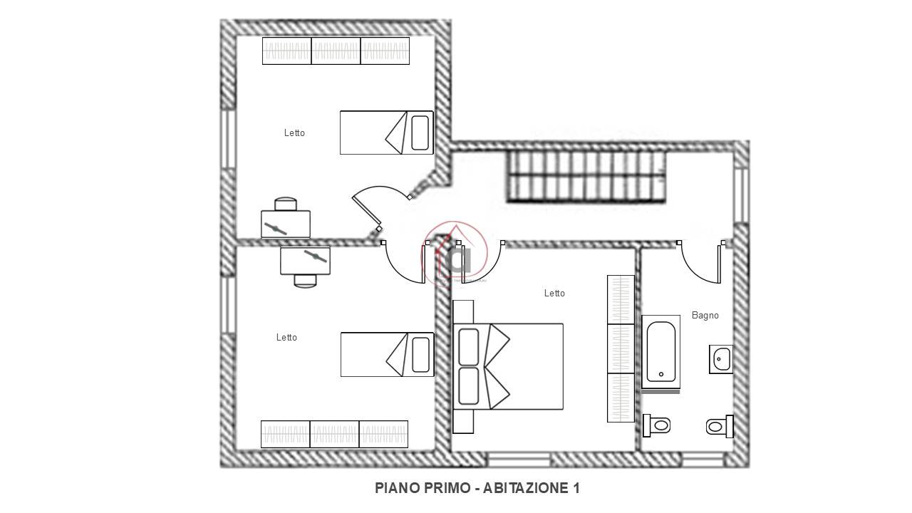 La terza soluzione che può essere anche accorpata ad una delle altre due unità è da ristrutturare completamente ed è composta da ingresso in soggiorno, camera da letto e cucinotto, oltre a vano scala da riadattare a bagno o ripostiglio eseguendo opere edili.